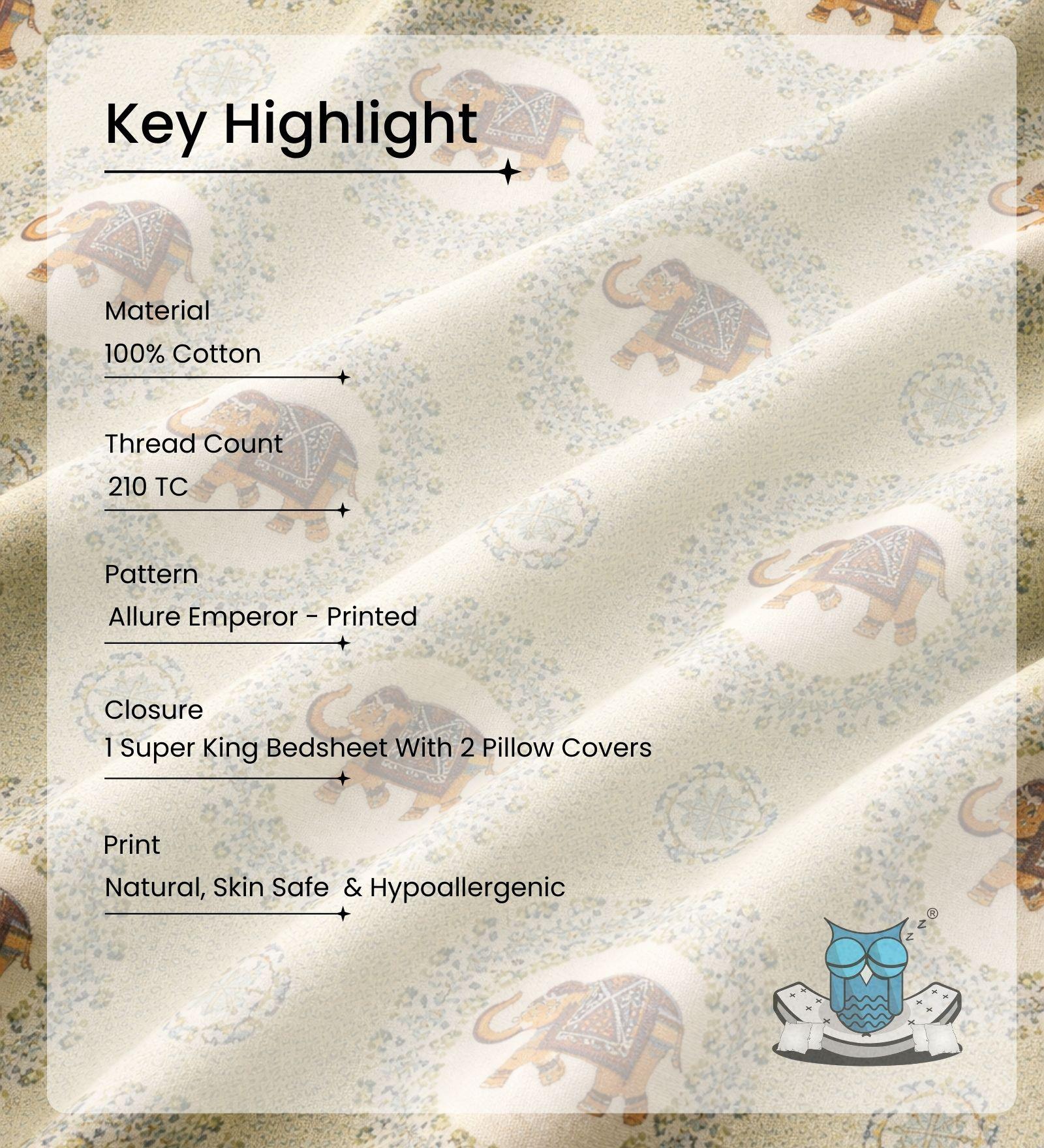 Sleeping Owls Allure Emperor 210TC 100% Soft Cotton Printed 1 super king Bedsheet with 2 Pillow Covers which will perfectly fit your bed. A pure cotton bedsheet is an ideal option for your bedroom, and the high thread counts ensure lasting durability.