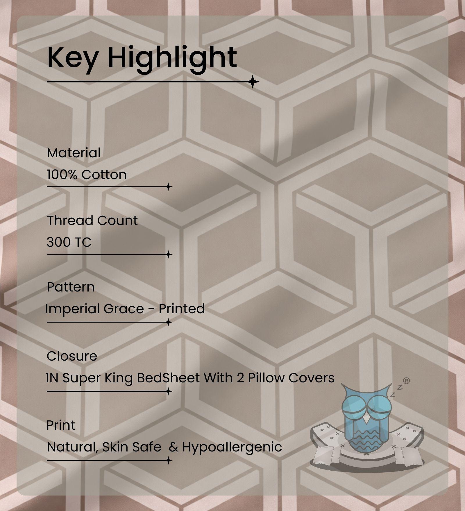 Sleeping Owls 100% Soft Mercerized Cotton Printed Imperial Grace 300TC Super King Bedsheet With 2 Pillow Covers